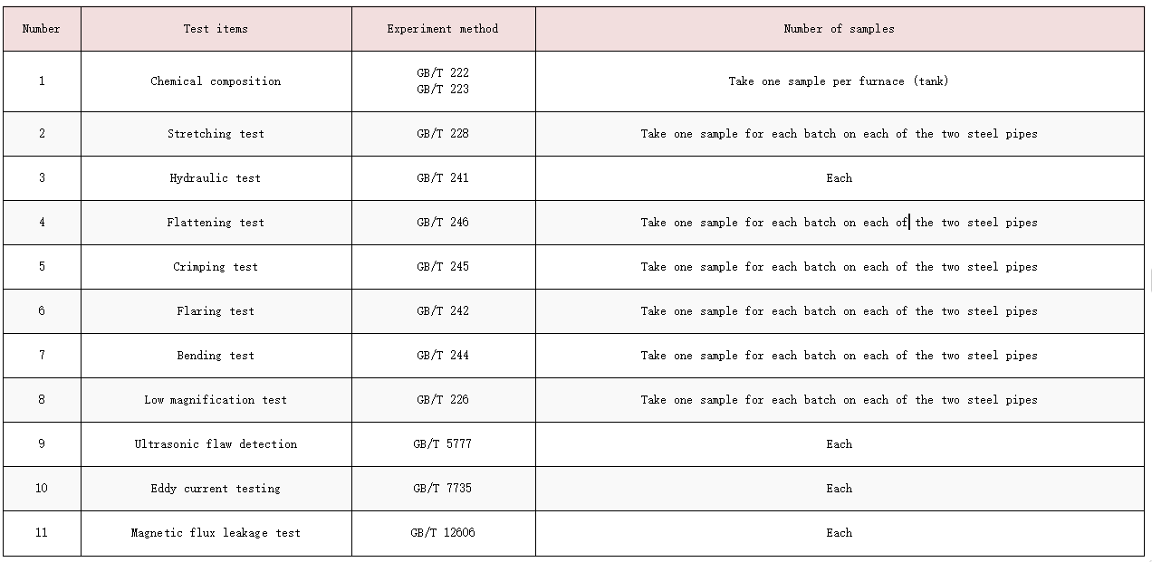 The sampling quantity of each inspection item of each batch of steel pipe shall be as specified in Table 6.