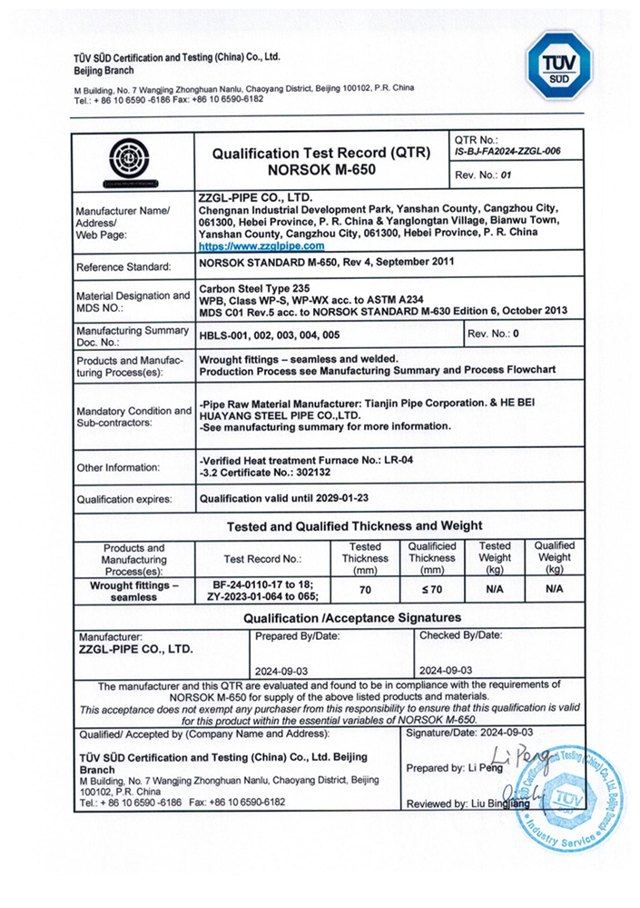 公司已通過挪威國家石油標(biāo)準(zhǔn)NORSOK M-650 ASTM A234 WPB認(rèn)證。