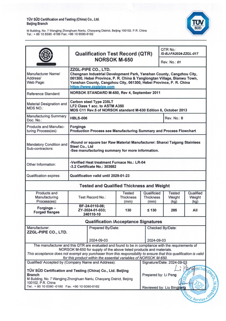 公司已通過挪威國家石油標(biāo)準(zhǔn)NORSOK M-650 ASTM A350 LF2認(rèn)證。
